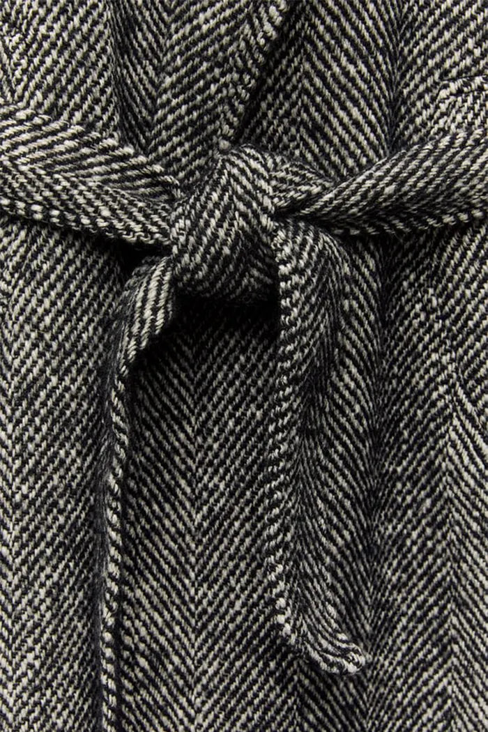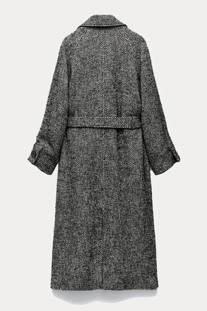 Un manteau long à l'allure impeccable, confectionné dans un somptueux motif à chevrons (Herringbone) Écru et Noir.